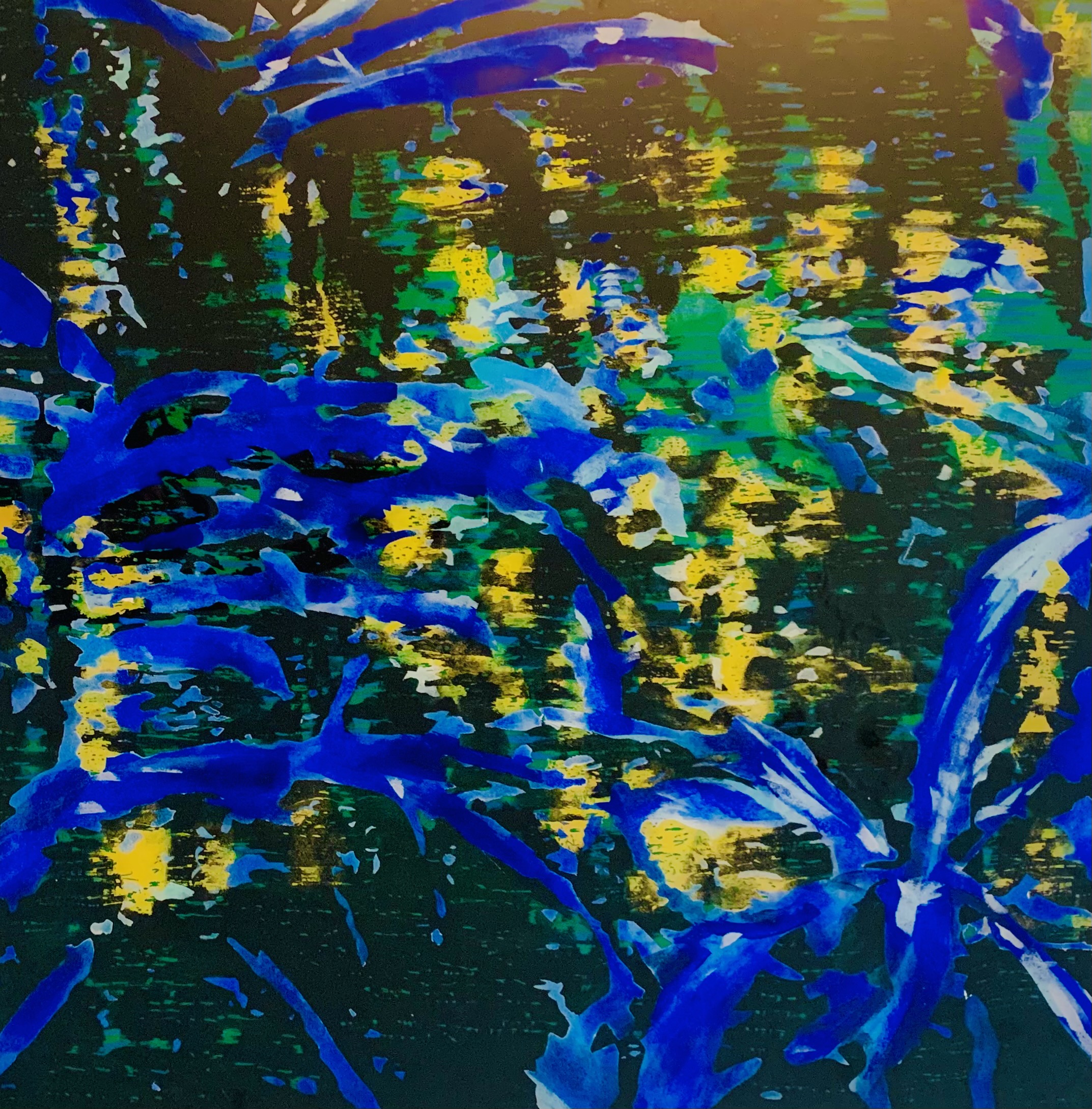 La foresta è il soggetto della rappresentazione. i colori predominanti della composizione sono il blu elettrico in contrasto con il bianco delle foglie in primo piano e il nero e il giallo rispettivamente le ompbre e le luci della foresta